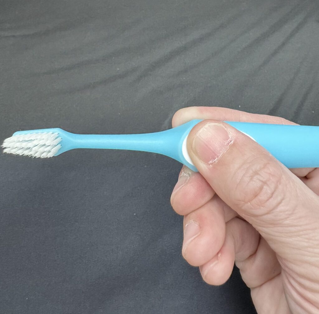 日本のドラッグストアでよく見かける歯ブラシとは明らかに異なるフォルムですが、実際に握ってみると設計意図がよく分かります。